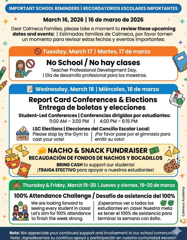 Parent-Teacher Conferences (NO SCHOOL)/ Día de conferencias entre padres y maestros (NO CLASES)