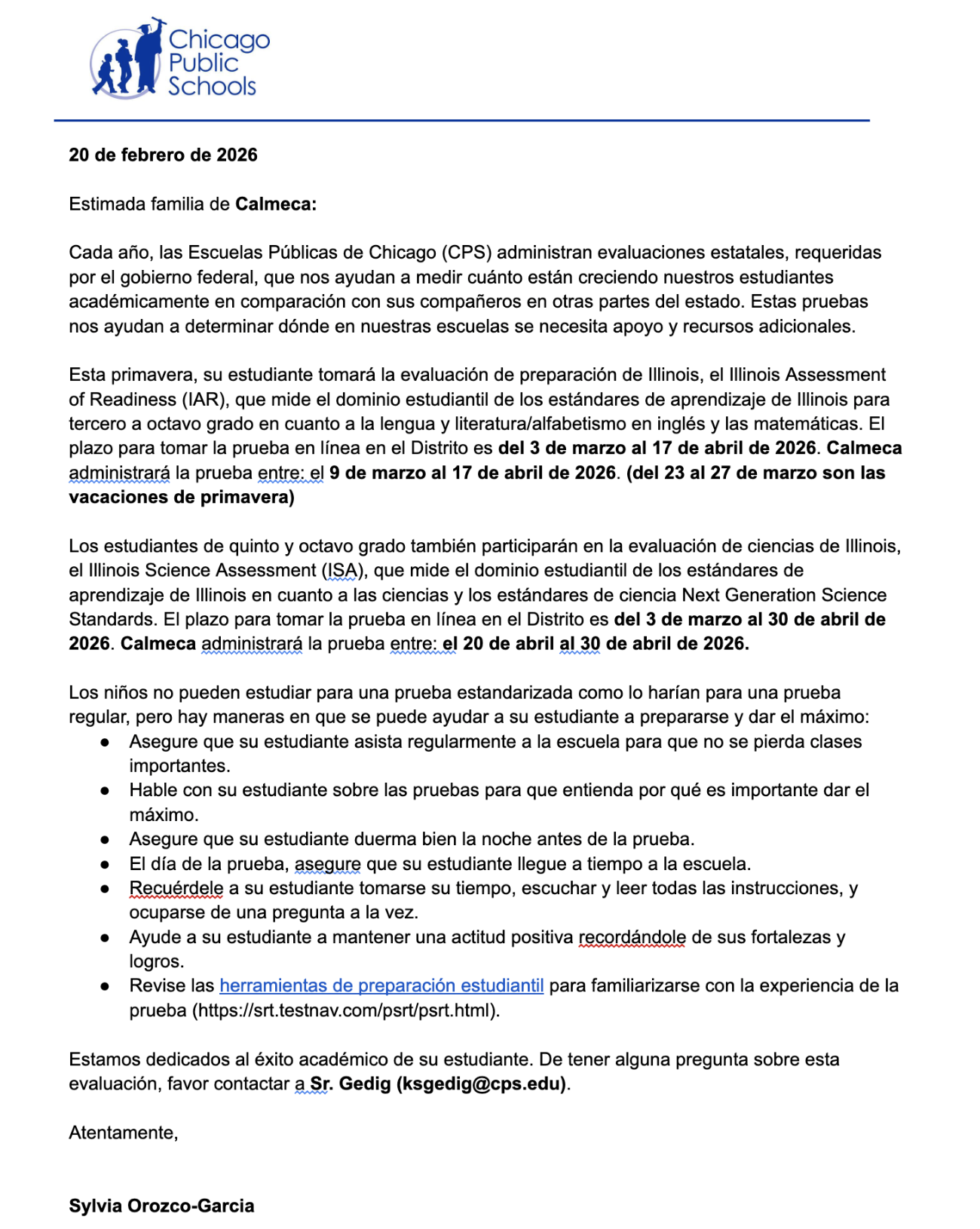 Calmeca will administer the test between: March 9 - April 17, 2026. (March 23 - March 27 is Spring Break)